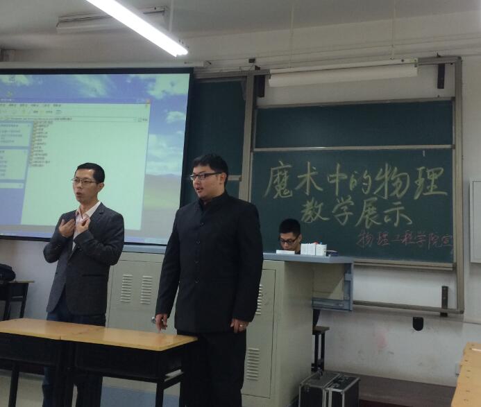 为加强学风建设,促进课堂教学效果。11月11日下午,beat365积极举办2016年学风建设月特色活动——“魔术中的物理”教学展示。洛阳市教育局中小学教研室暨洛阳市物理学会杜建国、席丽翎、周建萍、董峥,洛阳师范学院教师刘中利、杨海峰受邀参加了本次活动。学院领导李立本、刘国礼、巩晓阳、李新忠、沈兰及各系、教研室教师代表、学生代表参加了活动。“魔术中的物理”教学展示由我院优秀青年教师、第二届全国高等学校物理基础课程青年教师讲课比赛三等奖得主王翚老师主讲。