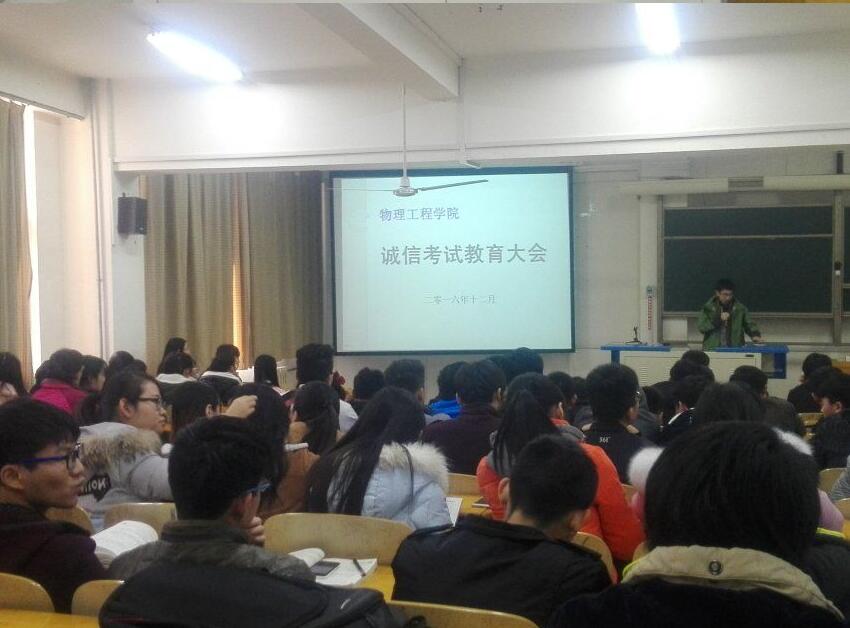 为规范我院学生考试行为,营造良好的学风考风,12月26日,物理工程院于公教5-301教室召开诚信考试教育大会。2015级全体学生参加大会,会议由学院团委副书记、2015级辅导员朱勇老师主持。