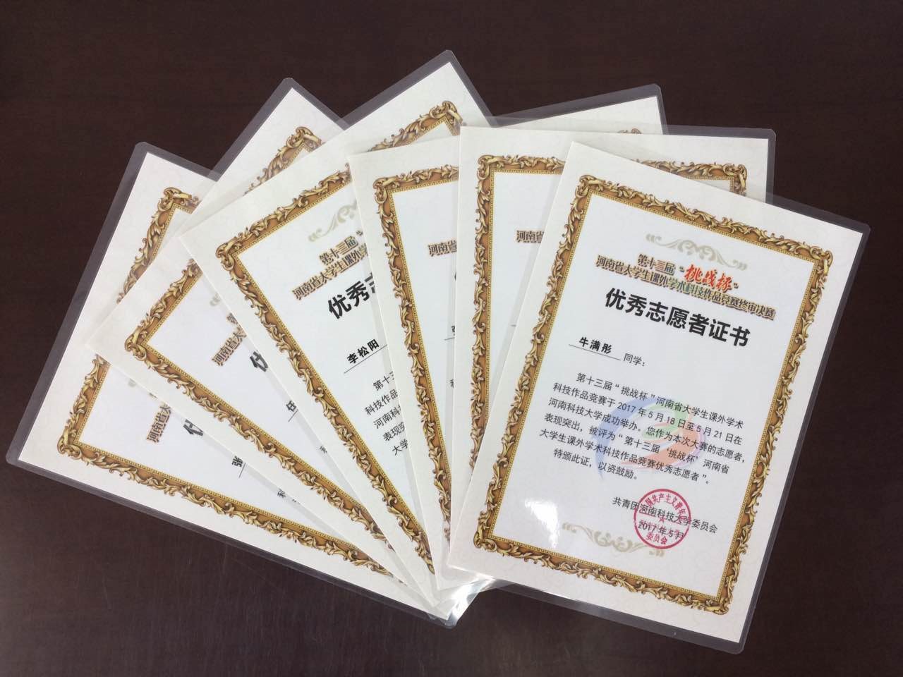 第十三届“挑战杯”河南省大学生课外学术科技作品竞赛于2017年5月18日至5月21日在河南科技大学成功举办。beat365李松阳、牛满彤、朱顺利、张翔云、任李贤、张鉴雄6名学生作为本次大赛的志愿者,积极工作,表现突出,被评为“第十三届‘挑战杯’河南省大学生课外学术科技作品竞赛优秀志愿者”,我院优秀志愿者人数在全校名列前茅。