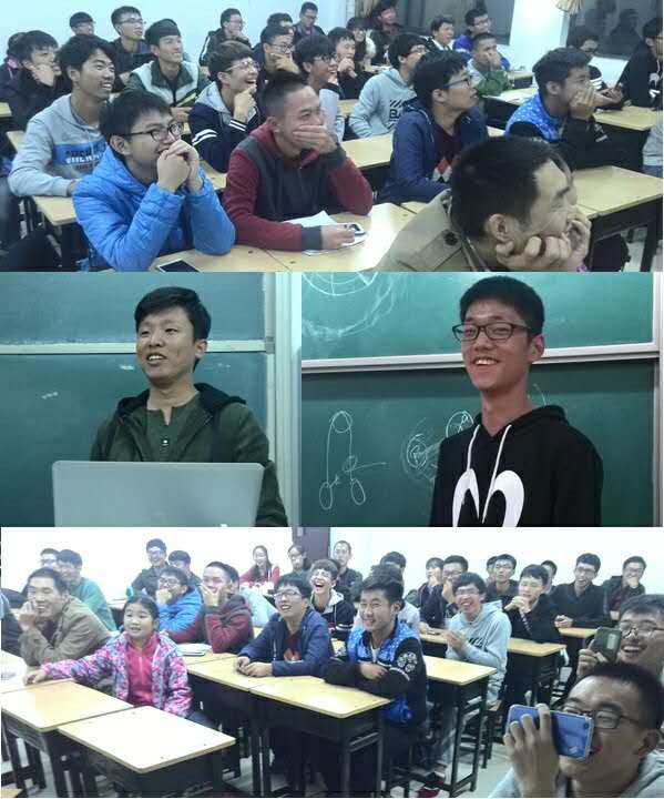 本次活动由王翚老师和李二强老师共同主持。首先,数应专业17级的李鹏翔同学给大家讲解了莱诺三角形的特点,展示了他利用硬纸板和饮料瓶制作的方轮车,并和大家分享了制作心得。随后,应物专业17级的王晓君同学给大家带来了神奇的珠帘喷泉实验:一条50米长的珠链链条,放置在一个杯子里面,拉起珠链的一端并使之垂落,这时链条会自发的向上运动,离开杯口,就像喷泉喷水那样。同学们被这神奇的现象惊呆了,开始积极思考它背后的物理原理,并踊跃发言。不知不觉就到了教室锁门的时间,可是同学们都意犹未尽。