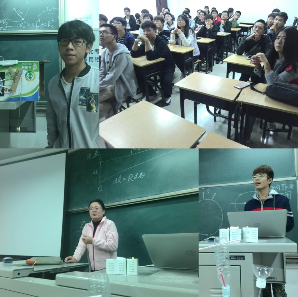 首先由王翚老师对前一阶段的“科学嘉年华”活动进行了总结,同学们分享了各自的体会。随后,滕德元、胡涛和蔡仲夏同学分别讲解了地球半径、日地距离和地球与比邻星距离的测量原理。三位同学准备充分,讲解清晰;王翚和李二强老师对视差法进行了补充说明;巩院长则对哈勃定理进行了深入的剖析。接着,滕德元同学向大家展示了他制作的“擒纵机构”。他使用纸箱、光盘、铁丝等简单的物品,将机械钟的运动原理生动的展现在大家面前。王翚老师将这个实验作品“没收充公”,腾德元显得很舍不得。