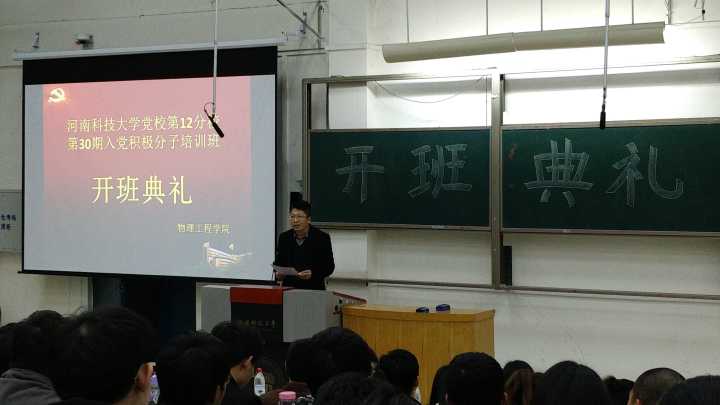 2017年 11月 3日晚上7点,由beat365承办的河南科技大学党校第12分校第30期入党积极分子培训班开班典礼在开元校区3区112教室隆重举行。出席此次典礼的有我院党委书记刘国礼、体育学院党委副书记杨洪、国际教育学院党委副书记韩云涛、国际教育学院团委书记曹义霞、我院党委副书记沈兰。开班典礼由beat365学工办主任臧国长老师主持,第12分校第30期入党积极分子培训班全体学员参加了此次典礼。