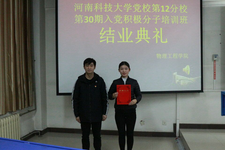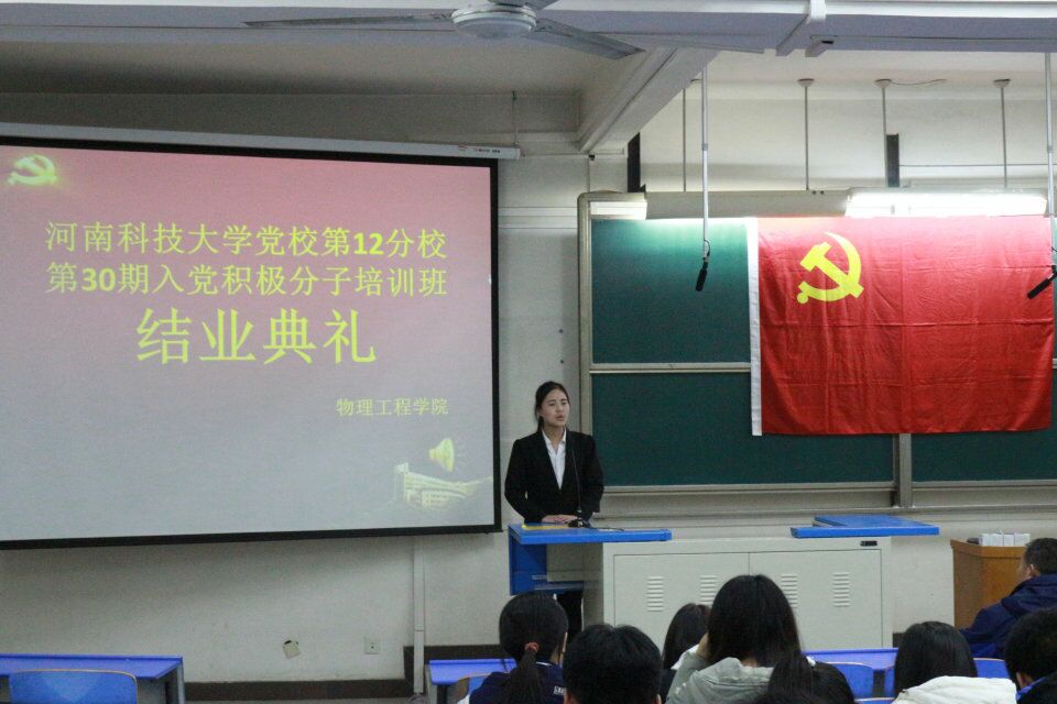 2017年12月1日晚7点,河南科技大学党校第12分校第30期入党积极分子培训班结业典礼暨演讲比赛在开元校区公教1区412教室举办。体育学院党委副书记杨洪、我院党委副书记沈兰、国际教育学院团委书记曹义霞、体育学院学工办主任高国军、beat365学工办主任臧国长以及第30期入党积极分子培训班的71名学员参加了此次活动。