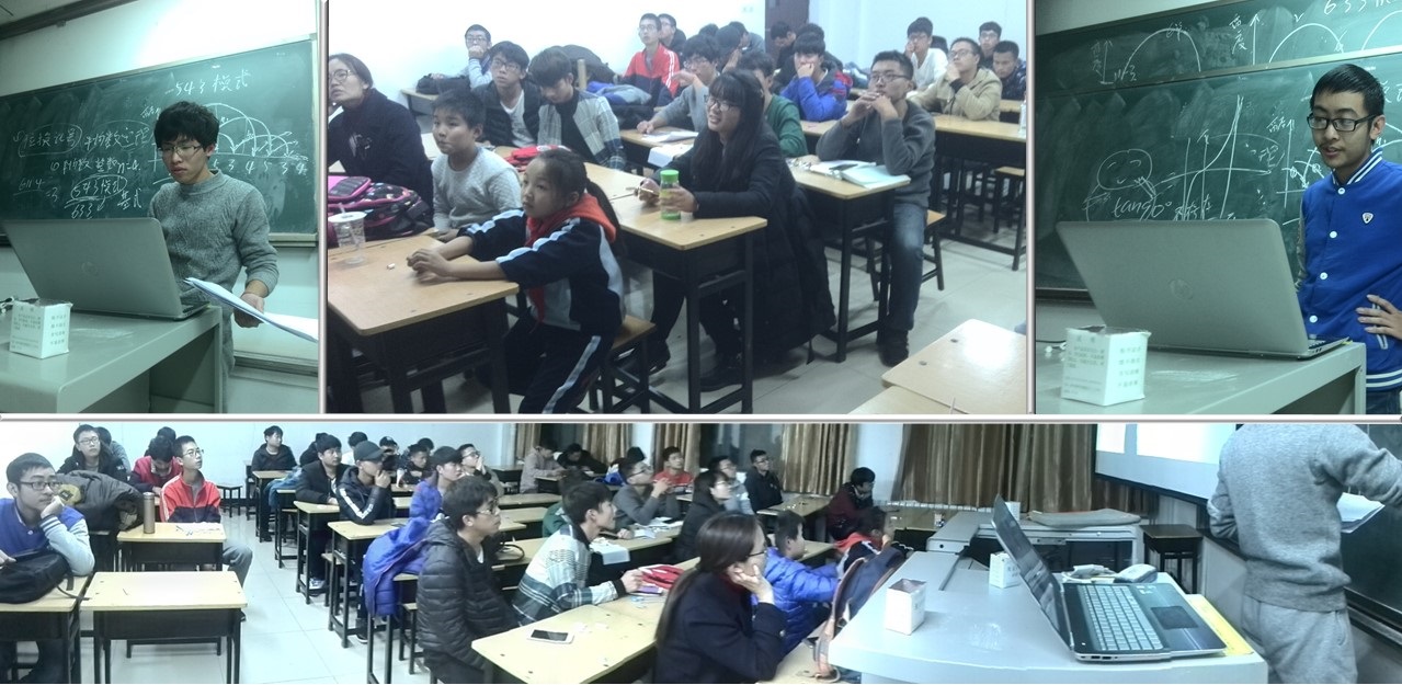 首先,王翚老师播放了自己表演了三球抛接的视频,然后由黄昌毅同学进行“这年头不懂点数学,可能连杂耍都玩不好”的报告。黄昌毅同学介绍了杂耍基本玩法模式的名称(奇数球用瀑泻,偶数用喷泉),接着讲解了利用位换记法标记小球的轨迹的方法,并结合动画和视频,使同学们理解了杂耍的运动规律。接着,孙超同学向大家详细介绍了一款杂耍软件的使用方法。他们两人的讲解非常成功,赢得了台下同学的热烈掌声。