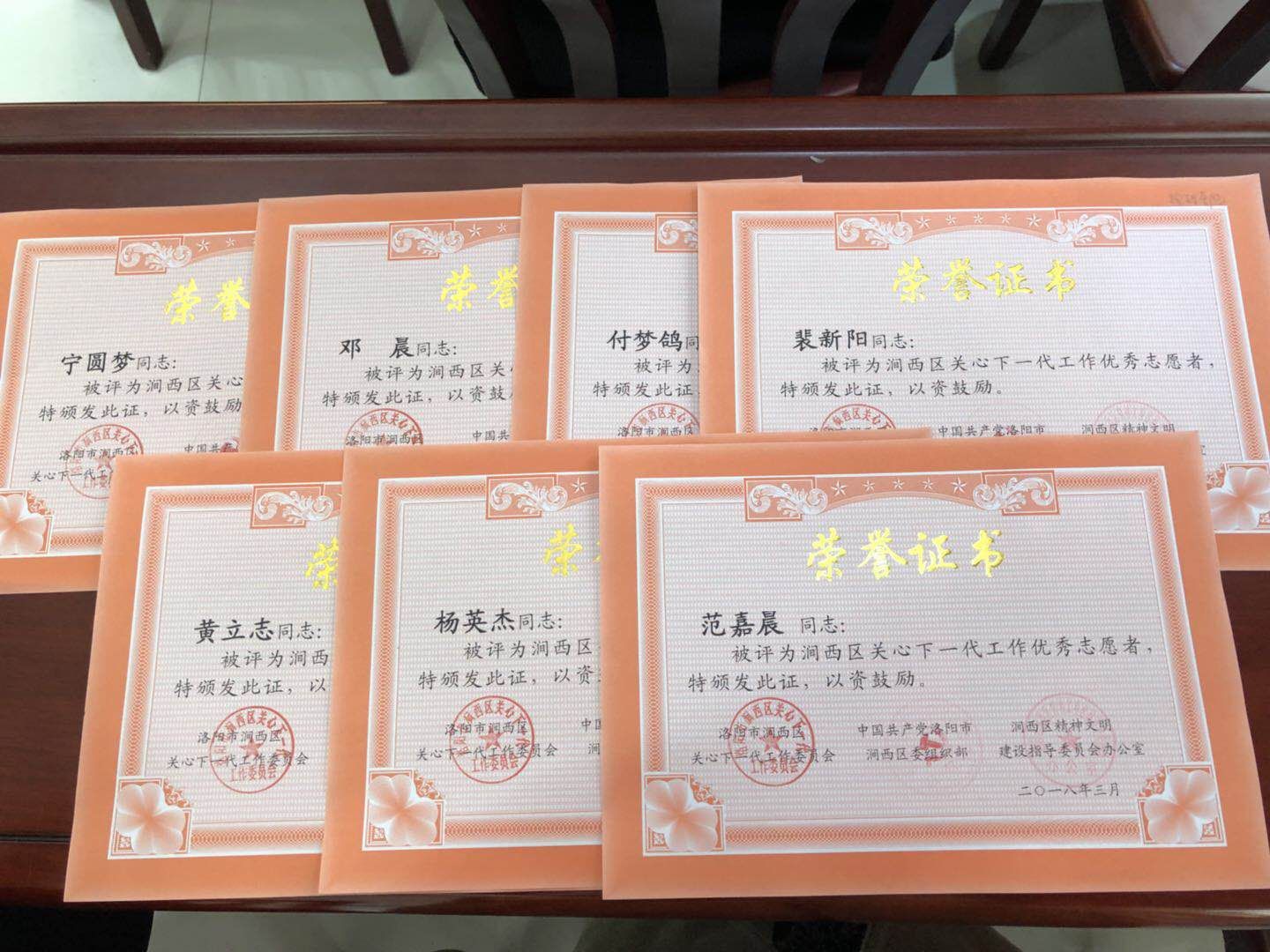 表彰大会上,beat365青年志愿者范嘉晨、裴新阳、宁圆梦、邓晨、付梦鸽、杨英杰、黄立志七名同学被授予“涧西区关心下一代工作优秀志愿者”荣誉称号。