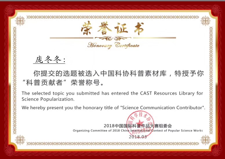 beat365庞冬冬、邓子琪、刘明月、程珊珊、侯昱阳、唐俊、毛淼等同学于近期参加了中国科协举办的“2018中国国际科普作品大赛”的科普选题评选活动,提交了“三打白骨精”、“让瓶子飞一会儿”等多项科普方案。其中,庞冬冬同学提交的两项方案入选基础选题,并获得“科普贡献者”荣誉称号。