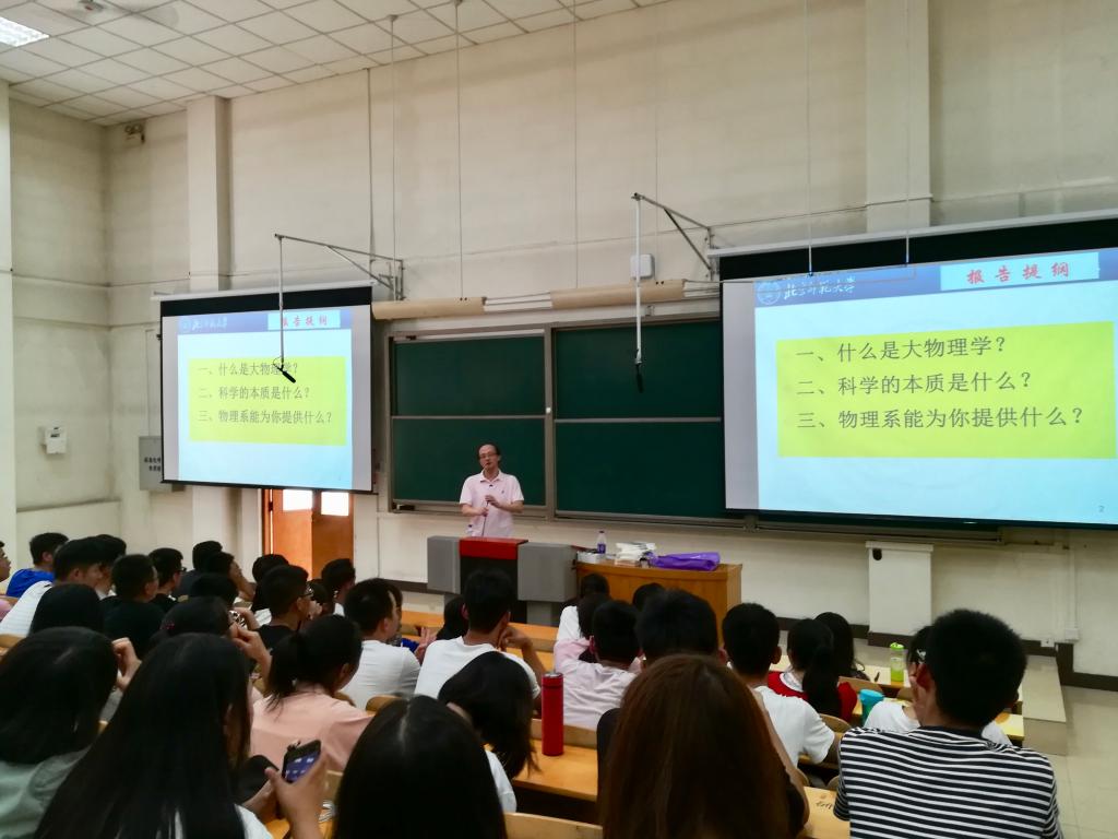 9月21日下午,北京师范大学包景东教授莅临我院,在公教4区105,为我院学子带来一场主题为《百年费曼与物含妙理》的讲座。讲座由beat365院长李立本主持,近三百名学生一起聆听了讲座。