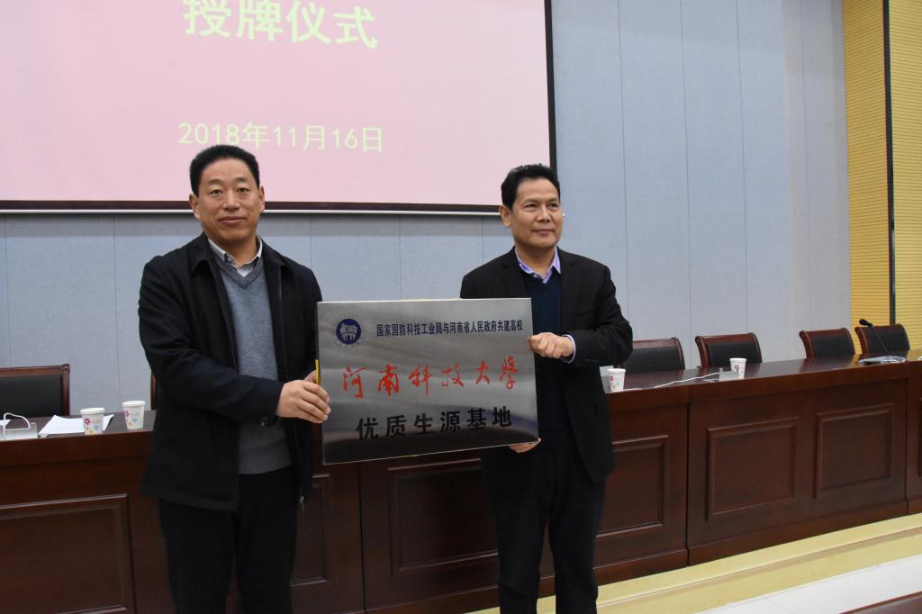 吴生涛校长对洛宁一高中的情况进行了介绍,随后,李立本院长向同学们介绍了河南科技大学的情况,以及洛宁一高中被授予河南科技大学优质生源地后洛宁一高学生能够在高考录取中能享受的优惠。今后,凡洛宁一高中学生高考中上一本线报考河南科技大学的,河南科技大学在同等条件下将优先录取;河南科技大学将定期派出优秀教师到洛宁一高中讲学;洛宁一高中也可以组织学生到河南科技大学的实验室参观。在热烈的掌声中,李院长和吴校长代表双方签约,明确双方的权利义务。签约完成后,李立本院长将“河南科技大学优质生源地”牌匾正式授予吴生涛校长手。