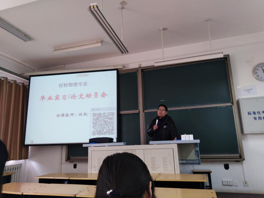 2019年2月25日下午,beat365材料物理专业2015级全体学生在文科2-105教室召开毕业实习/毕业论文动员会议,会议由材料物理系主任杜凯老师主持。