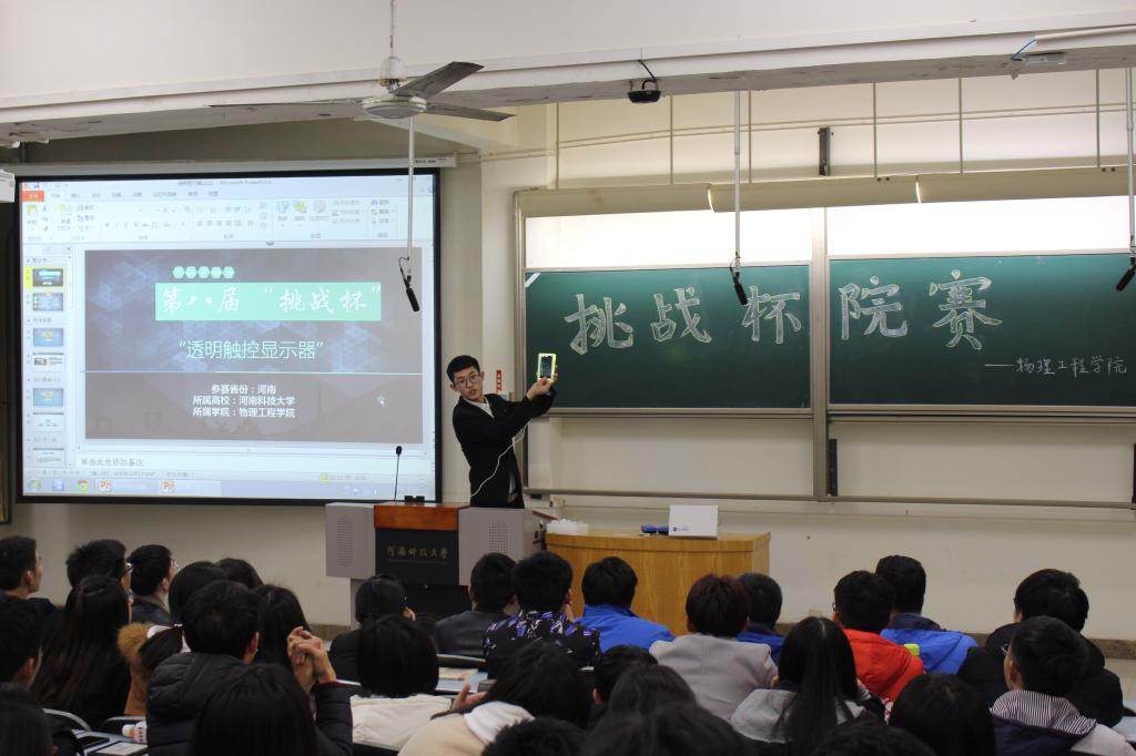 2月28日晚,beat365“挑战杯”大学生课外学术科技作品竞赛在开元校区公教3-105教室举行。应用物理系主任王晓飞老师,应用物理系王翚老师,光电信息科学与工程系副主任李秋泽老师,物理实验教学中心副主任周锋子老师,材料物理系金秀娟老师,院团委副书记朱勇老师担任本次比赛评委,比赛由王梦月同学主持。