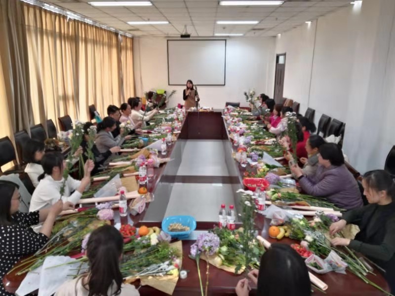 随着“三.八”节日渐临近,女工委员刘香茹老师就思考着如何让广大女职工过一个幸福而有意义的节日。通过反复商量,决定一改往年“走出去”的庆祝方式,请花店的花艺师为广大女职工上一堂“花艺课”。经联系,女工们购买了玫瑰、绣球、小雏菊、康乃馨等花材,并准备了剪刀、丝带、彩纸包装器材与备料。