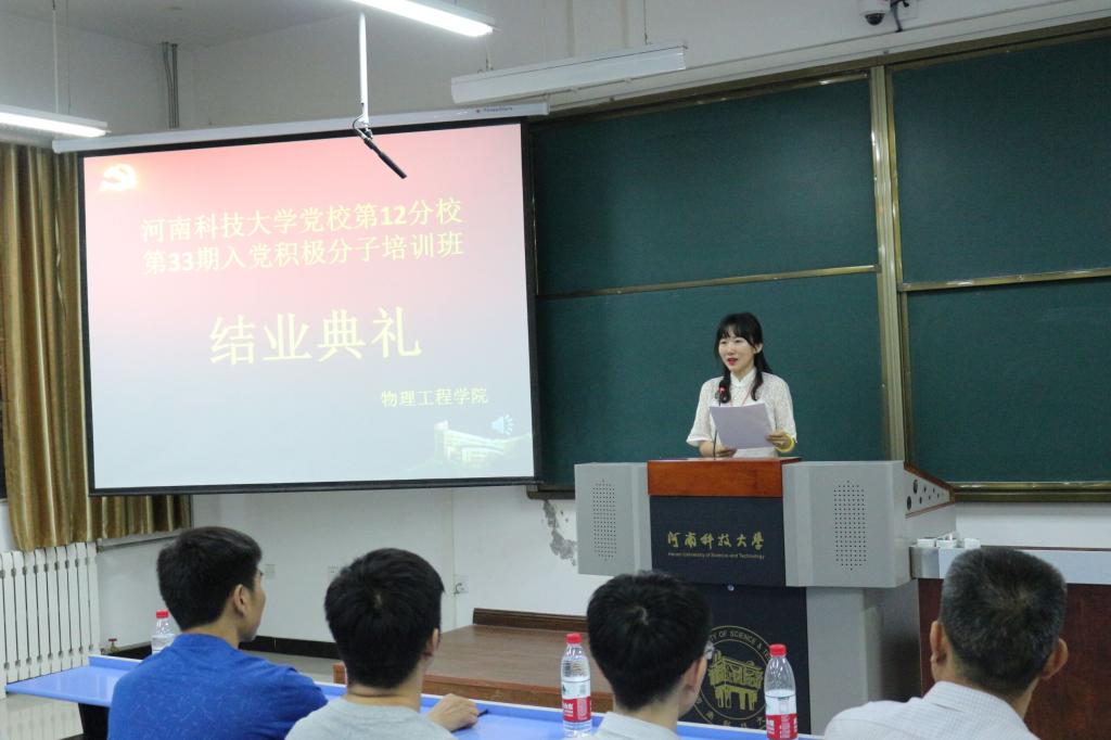 5月22日晚7点,河南科技大学党校第12分校第33期入党积极分子培训班结业典礼暨汇报演讲比赛在开元校区农医教107教室举办。国际教育学院党委副书记韩云涛、体育学院党委副书记杨洪、我院党委副书记沈兰、院学工办主任臧国长、院团委副书记朱勇以及第33期入党积极分子培训班的69名学员参加了此次活动。