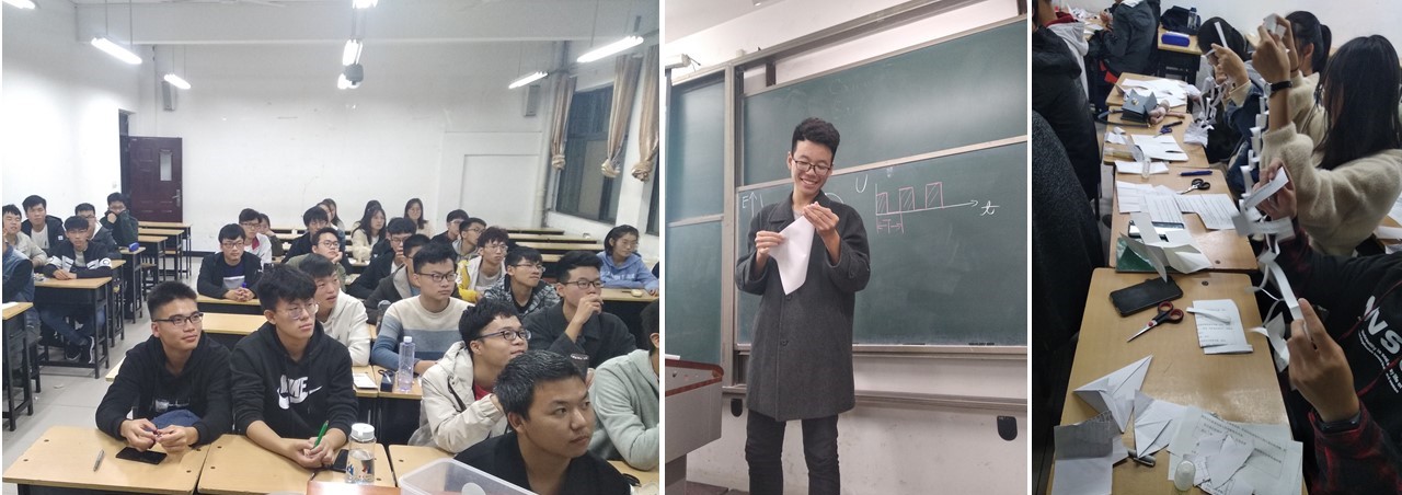 首先,王翚老师通过视频方式为同学们演示了关于纸的各种实验,并讲解了关于纸的一些神奇特性。随后应物专业的段泽欣同学为大家讲解了他的实验项目,解释了实验过程中容易出现的各种错误。王翚老师与各位同学利用生活中随处可见的普通纸片完成了“自动站立折纸”实验和其它多个的与纸有关的神奇实验,结合实验为同学们讲解了折纸在生活及工程中国的应用,激起了同学们对其中原理的兴趣。