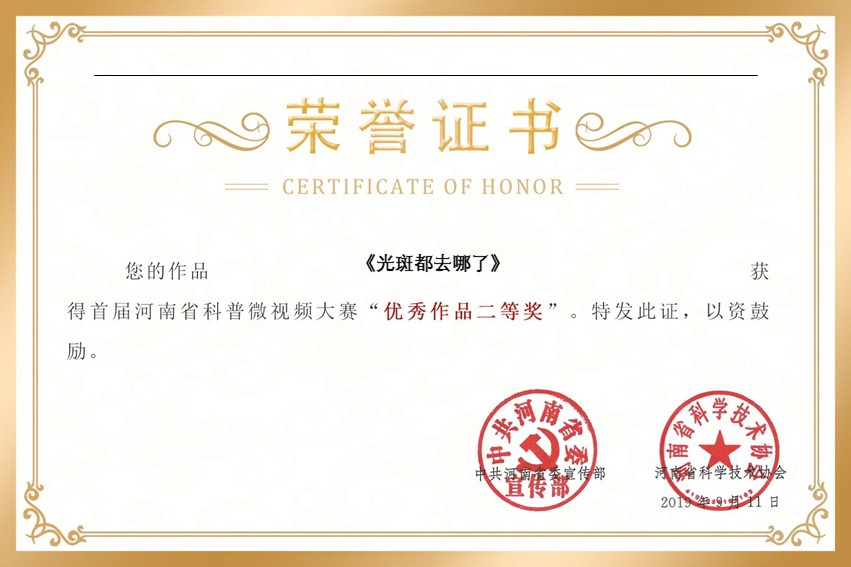 我院积极组织学生参与该项赛事,在王翚老师指导下,同学们团结协作、积极创新,作品《光斑都去哪了》、《让瓶子飞一会儿》荣获首届河南省科普微视频大赛优秀作品二等奖,《节拍器耦合》、《蛇形摆》荣获首届河南省科普微视频大赛优秀作品三等奖。