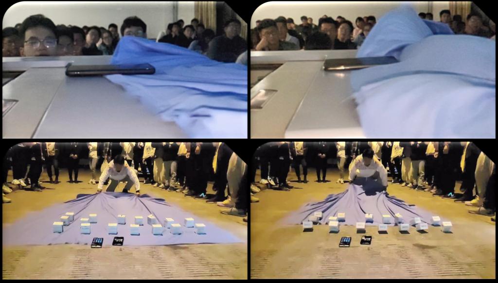首先,王翚老师播放视频让大家观看“令人震撼”的短片,并让大家思考其中的科学原理。在老师的讲解下,同学们知道了上百个餐具下的餐布是如何被拉出的,同学们了解到小型实验效果放大后是真的很震撼人心。随后,同学们用自己的手机来做实验品。在抽拉桌布之前,同学们各个都忐忑不安,生怕实验失败,摔坏手机。在实验成功之后,悬着的心终于放下了。我们要有自信,要相信科学。