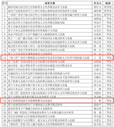 近日,河南省教育厅公布了2021年度河南省高等教育教学成果奖获奖项目名单,我院王翚老师主持的《“新工科”背景下物理演示实验的开发及 其在创新人才培养中的探索与实践》获一等奖、王辉老师主持的《基于科研背景的半导体物理教学改革探讨》获二等奖。