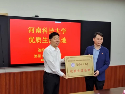 姚纲代表河南科技大学向洛阳市第十九中学授牌,李新忠和陈广辉分别代表双方签订优质生源基地建设协议书。