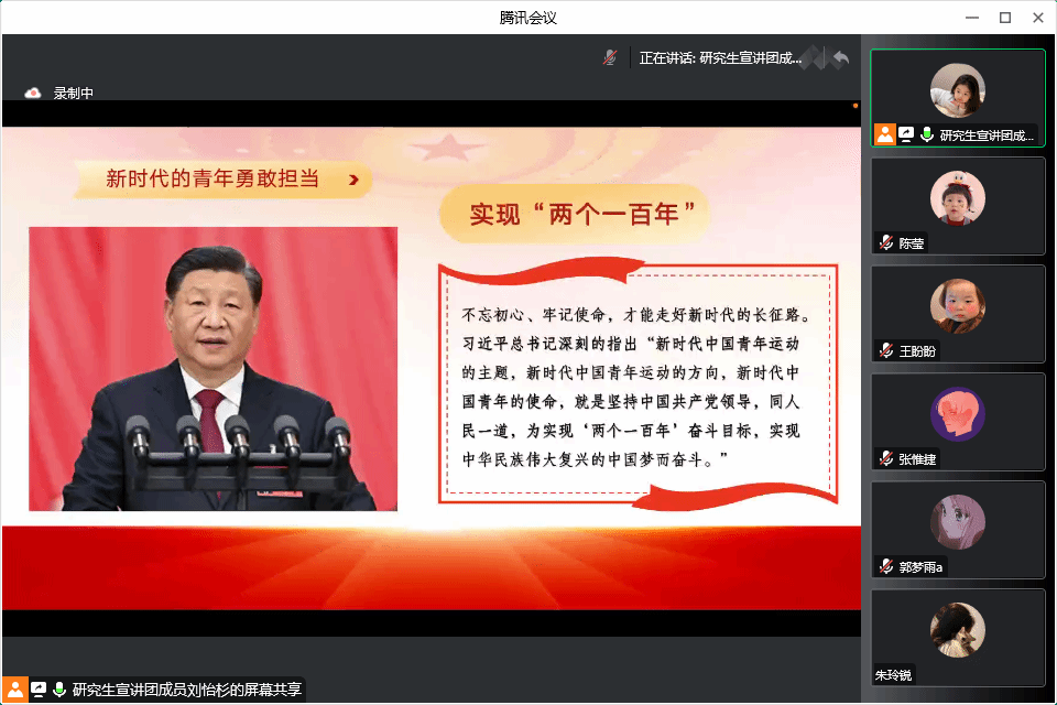 为庆祝党的二十大胜利召开,学习党的二十大精神,10月25日晚7时,由研究生宣讲团成员刘怡杉同学面向我院全体研究生,以“学习二十大 奋斗正青春”为主题进行宣讲。
