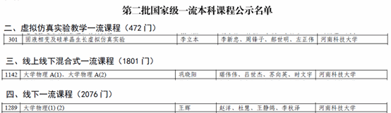近日,教育部公布了第二批国家级一流本科课程认定结果,我院3门课程成功入选,实现了学院国家级课程的历史性突破。其中李立本教授负责的《固液相变及硅单晶生长虚拟仿真实验》入选虚拟仿真实验教学一流课程,巩晓阳教授负责的《大学物理 A(1)、大学物理A(2)》入选线上线下混合式一流课程,王辉教授负责的《大学物理(1)(2)》入选线下一流课程。