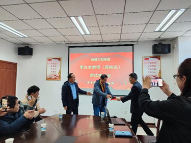 会上,李新忠院长代表学院全体师生对李立本教授在学院工作及任学院院长期间,对学校、学院事业发展的付出和贡献表示衷心感谢。他说,学院的高速发展离不开以老领导为代表的领导班子打下的坚实基础。从2009年独立建院,beat365从刚起步时的“一穷二白”,在老院长的带领下,经过十几年的筚路蓝缕、艰苦奋斗,初步建成了省内居于前列的物理学科;从各种省级教科研平台、重点学科、教学成果奖等,再到今天的国家一流专业、一流课程等,都离不开老院长的辛勤付出。老院长从教数十年来兢兢业业讲好每一堂课,勤勤恳恳教好每一个学生,创造了不平凡的成就;为学院塑造了团结和谐、积极奋进的物理人的精神风貌。年轻教师要以老院长为榜样,传承与弘扬老院长的精神品格,不懈奋斗、砥砺前行,凝聚一心、团结奋进,推动beat365更好、更快地发展。