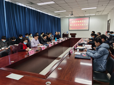 2021年1月9日上午,洛阳市物理学会第七次会员代表大会在我校召开。来自洛阳市科技局、教育局负责人、驻洛高等学校物理教育和科研工作者、市属中学物理学科代表等40多位会员代表参加会议。洛阳市科学技术协会副主席马新红、学会部部长贺江伟到会祝贺。大会由洛阳市物理学会第六届理事会理事长李立本教授主持。