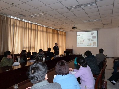 王新研究员详细介绍了他们课题组近年来在稀土掺杂纳米晶的多模式生物影像造影剂及纳米药物载体方面的重要研究成果,同时,也对其研究结果在肿瘤的诊断和治疗中的应用进行了系统的阐述。报告会后,王新研究员与现场的老师及学生就不同类型的生物影像造影剂的发光性能及纳米药物载体在肿瘤治疗中的应用等方面进行了广泛、深入地交流和讨论,并对在场人员的疑问给予了详细地解答。此次报告会不仅加深了我院师生对功能纳米材料及纳米生物学的认识,拓宽了专业视野,也进一步促进了我院与中国科学院苏州纳米技术与纳米仿生研究所的合作与交流。