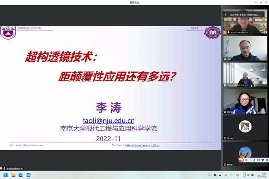 李涛教授从超构透镜成像中的色差与像差矫正切入,针对传统显微镜视场受限的瓶颈性问题,介绍了其研究团队近期发展的多阶衍射透镜技术,及其最新研制出的仅厘米级尺寸的超小型显微镜和超薄型广角成像超构相机。报告会后,李涛教授就超构透镜成像技术等热点问题与在线师生进行了交流。