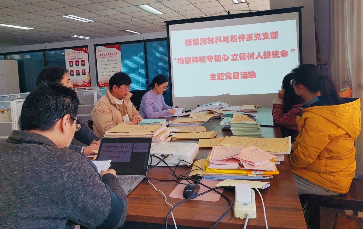 2023年12月25日上午,新能源材料与器件系党支部开展“培根铸魂守初心 立德树人担使命”主题党日活动,会议由支部书记杜凯同志主持。