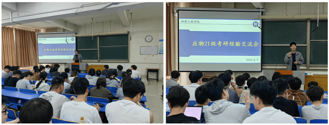 首先,王晓飞老师向同学们介绍了应物20级的考研情况,考研率达到45%,取得了优异成绩,王老师对此表示了肯定。随后,应物20级张灿、宋坤炜等六位优秀学生结合自身考研经历,从院校选择、备考科目、复习安排以及复试准备等多方面向应物21级学生做了全面且深入的交流。最后,郭予光书记强调,同学们要积极备考,同时也要注意自身健康安全。参会学生们反应热烈,情绪高涨,互动情况良好。