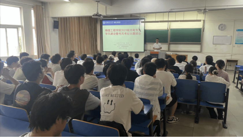 为进一步加强学风建设,严肃考风考纪,2024年6月6日下午,光电专业在公教二区308教室召开了2023级光电专业学风建设暨考风考纪主题班会。活动由2023级光电专业学业导师张浩老师主持,光电专业系主任李秋泽老师及2023级光电专业全体学生参加会议。