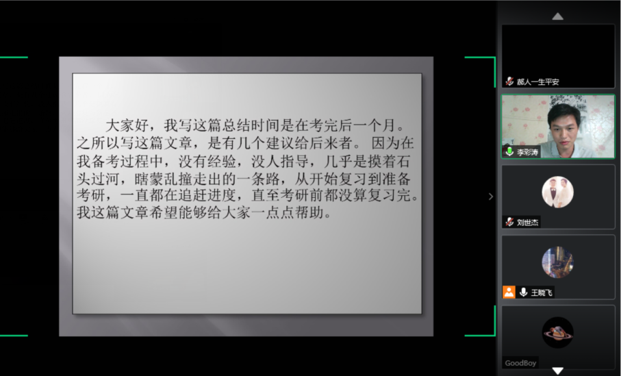 随后,2016级的刘天明(考取中科院上海天文台)、李彩涛(考取华南师范大学)、任李贤(考取中科院新疆理化所)、李运琴(考取吉林大学)、张鉴雄(考取河南大学)等五位同学对自己考研过程中的经验和问题一一发言,并分别从选校、备考、复试等几个方面讲解了自己的宝贵经验:强调了复习过程中坚持与自我控制力的重要性,同时多多搜集往年真题,并与所考学校及时沟通。