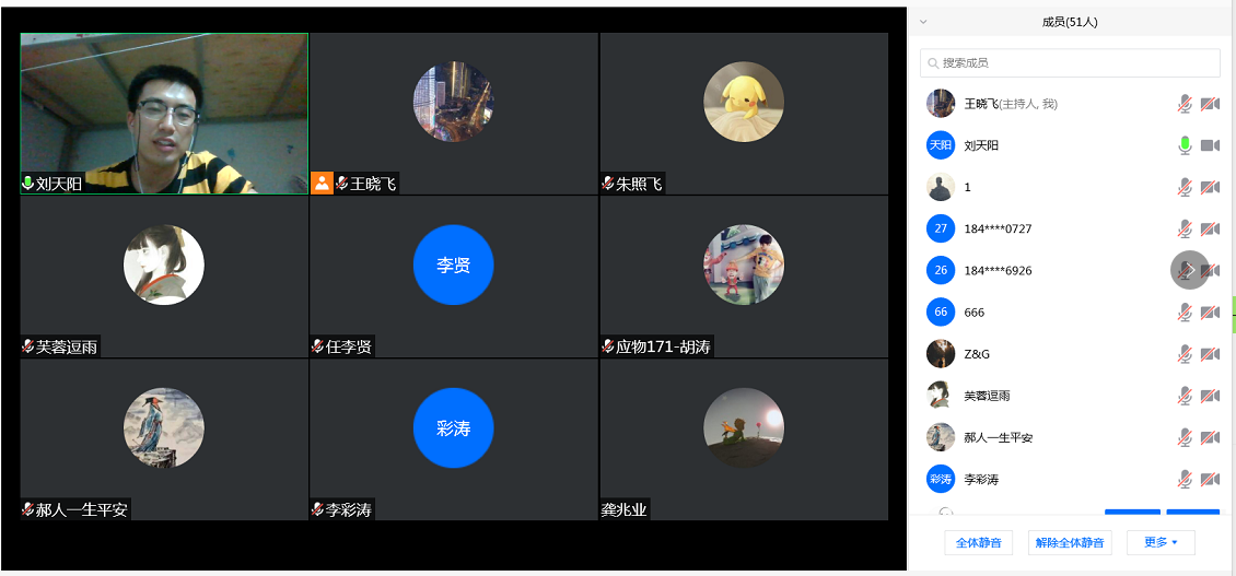 2020年6月11日下午,我院应用物理系进行了考研交流线上视频会议,会议由应用物理系主任王晓飞主持,副主任郝世明、学业导师刘世杰、2016级考研成绩突出的学生代表及2017级应用物理学专业全体学生参加了会议。