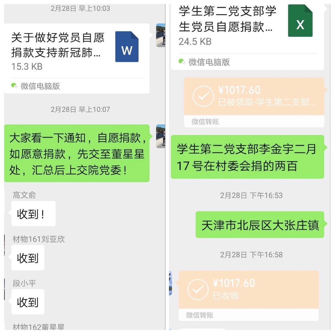 在接到校党委《关于做好党员自愿捐款支持新冠肺炎疫情防控工作的通知》后,学生第二党支部在党支部书记臧国长老师的号召下,全体党员积极行动,慷慨解囊,仅用时2个小时,支部32名学生党员全部捐了款(其中李金宇同志已经在当地捐款200元),共筹得款项1217.6元。