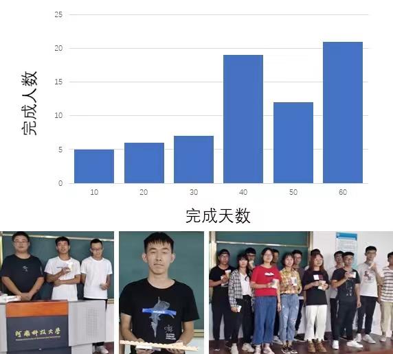 暑期英语单词的背诵要求为每天使用百词斩软件背诵70以上的个单词,并通过“雨课堂”发送截图提交作业。暑期有效背诵时间共计62天,其中完成50天以上的同学有21人,50至40天的有12人,40至30天的有19人,30至20天的有6人,10天以下的有5人。完成40天以上任务的同学受到了表彰,其中谢详意同学共完成61天的任务,名列第一。对少于20天的同学进行了批评。