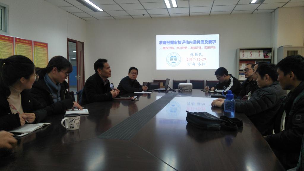 随后,会议主体内容分两部分展开:一是集中学习了河南省教育评估中心副主任张新民教授关于《准确把握审核评估内涵特质及要求》的报告;二是结合教师个人教学情况,探讨“双创”课程的准确定位和顺利开展。
